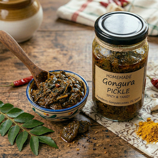 Gongura Pickle A bold Andhra classic this gongura (sorrel leaves)-based pickle blends the tangy, naturally sour notes of fresh gongura with the fiery heat of red chillies and a rich mix of traditional spices.
